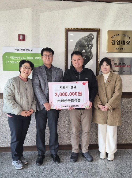 ㈜상신종합식품은 12월 17일 천안시 성환읍에 취약계층을 지원하기 위한 후원금 300만 원을 기탁했습니다.